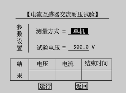 試驗電壓:指本次試驗交流輸出保持電壓?!皢螜C”時,儀器默認電壓值為500V,內置升壓器電壓范圍為(0~1000)V,在AC220V電源輸入情況下最高輸出電壓為600V,在AC380V電源輸入情況下最高輸出電壓1000V?;ジ衅骶C合特性測試儀選用“升壓器”時,儀器默認電壓值為1500V,外接升壓器電壓范圍為(0~2500)V。