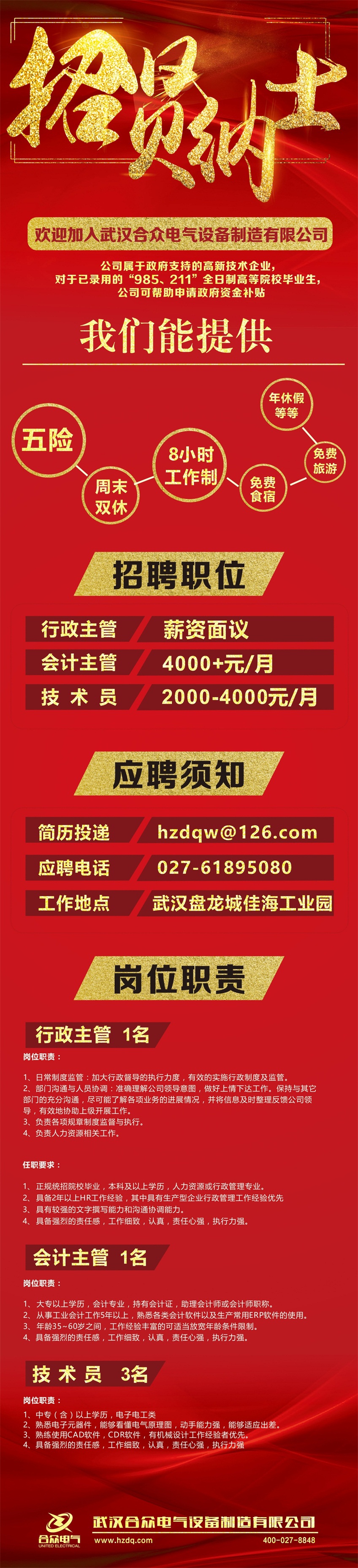 武漢市合眾電氣設(shè)備制造有限公司成立于2002年,注冊(cè)資金2100萬(wàn)元,是一家專業(yè)生產(chǎn)和銷售電力檢測(cè)、試驗(yàn)設(shè)備的高新技術(shù)企業(yè)。公司擁有大批多年從事高電壓試驗(yàn)、檢測(cè)設(shè)備設(shè)計(jì)、生產(chǎn)的專業(yè)技術(shù)人才,嚴(yán)格按照國(guó)際化標(biāo)準(zhǔn)管理企業(yè),嚴(yán)格執(zhí)行ISO9001國(guó)際質(zhì)量體系標(biāo)準(zhǔn),堅(jiān)持不斷改革、創(chuàng)新。經(jīng)過(guò)多年積極努力經(jīng)營(yíng),已成長(zhǎng)為一家集科研、開發(fā)、生產(chǎn)、銷售、服務(wù)為一體的高科技現(xiàn)代電力設(shè)備生產(chǎn)企業(yè),獲得行業(yè)眾多榮譽(yù),得到行業(yè)一致認(rèn)可。公司重視人才的培養(yǎng),定期為員工提供專業(yè)的技能培訓(xùn),為每位員工提供廣闊的發(fā)展平臺(tái),現(xiàn)因公司的業(yè)務(wù)的拓展和規(guī)模的擴(kuò)大,現(xiàn)招募以下職位,歡迎各位滿足條件的朋友踴躍報(bào)名,一經(jīng)錄用待遇從優(yōu)!