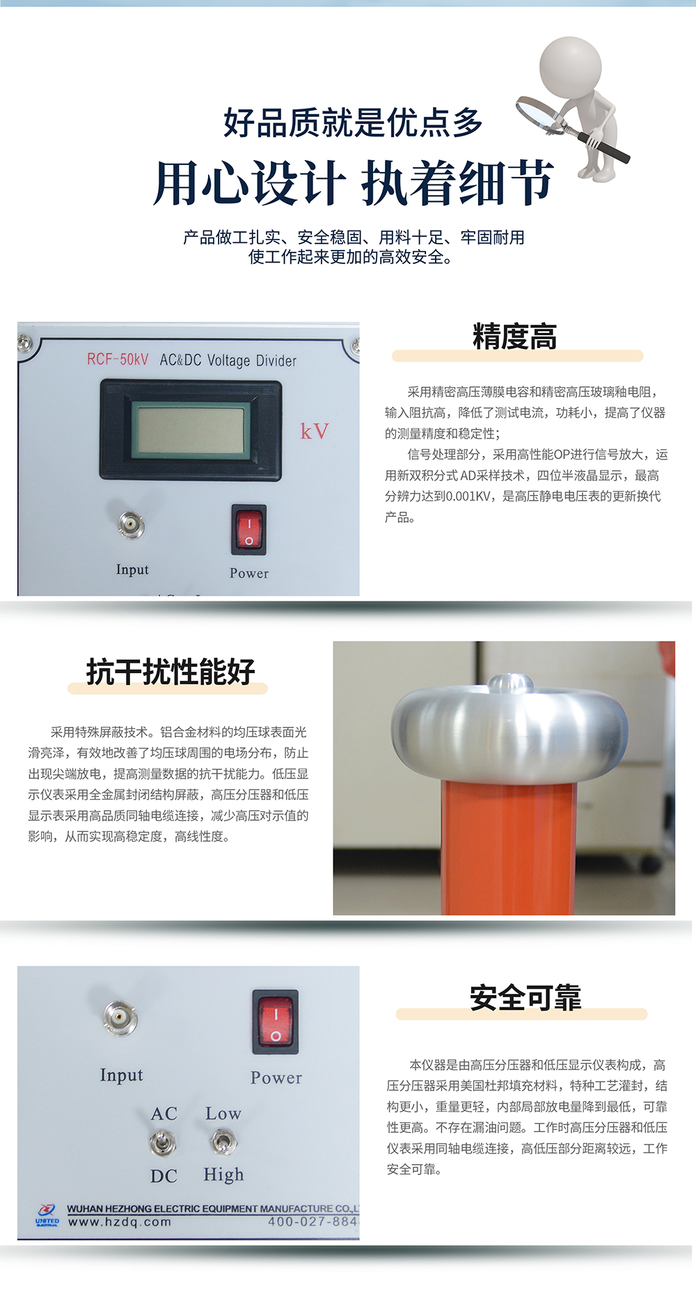 采用特殊屏蔽技術(shù)。鋁合金材料的均壓球表面光滑亮澤,有效地改善了均壓球周?chē)碾妶?chǎng)分布,防止出現(xiàn)尖端放電,提高測(cè)量數(shù)據(jù)的抗干擾能力。低壓顯示儀表采用全金屬封閉結(jié)構(gòu)屏蔽,高壓分壓器和低壓顯示表采用高品質(zhì)同軸電纜連接,減少高壓對(duì)示值的影響,從而實(shí)現(xiàn)高穩(wěn)定度,高線性度。