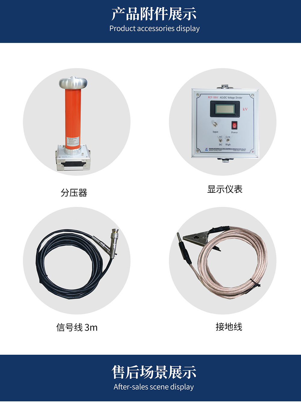 本產(chǎn)品作為高電壓測(cè)量之理想設(shè)備,主要用于電力系統(tǒng)及電氣電子設(shè)備制造部門(mén)測(cè)量工頻交流高電壓和直流高電壓。本儀器由高壓分壓器和低壓顯示表兩部分組成,兩者采用配套電纜連接使用。