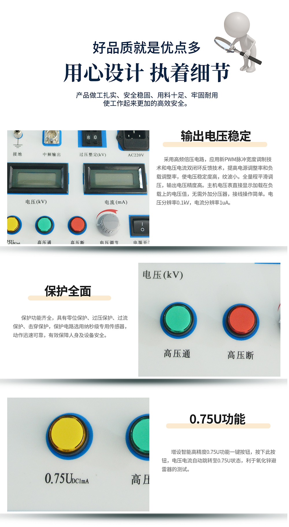 7、性能可靠:關鍵器件選用高性能進口元件,倍壓筒外表涂特種絕緣材料,電氣性能好、防潮能力強、無泄漏。
