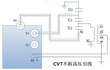 3、反接屏蔽法測量CVT上端C0的電容值和介損測量模式:反接法。電壓≤2kV