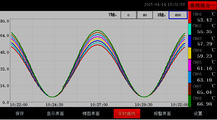 當前曲線記錄只保留單屏的顯示數據,可根據觀察的需要,通過改變Y軸和時標X軸來改變顯示刷新的速度,各條曲線一致,并不影響FLASH記錄的時間間隔。