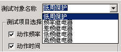 測試對象名稱中包含“低周保護(hù)”、“頻率繼電器”、“差頻繼電器”、“低頻繼電器”以及“高頻繼電器”五種繼電器。默認(rèn)情況下選擇“低周保護(hù)”。其下拉菜單如圖所示: