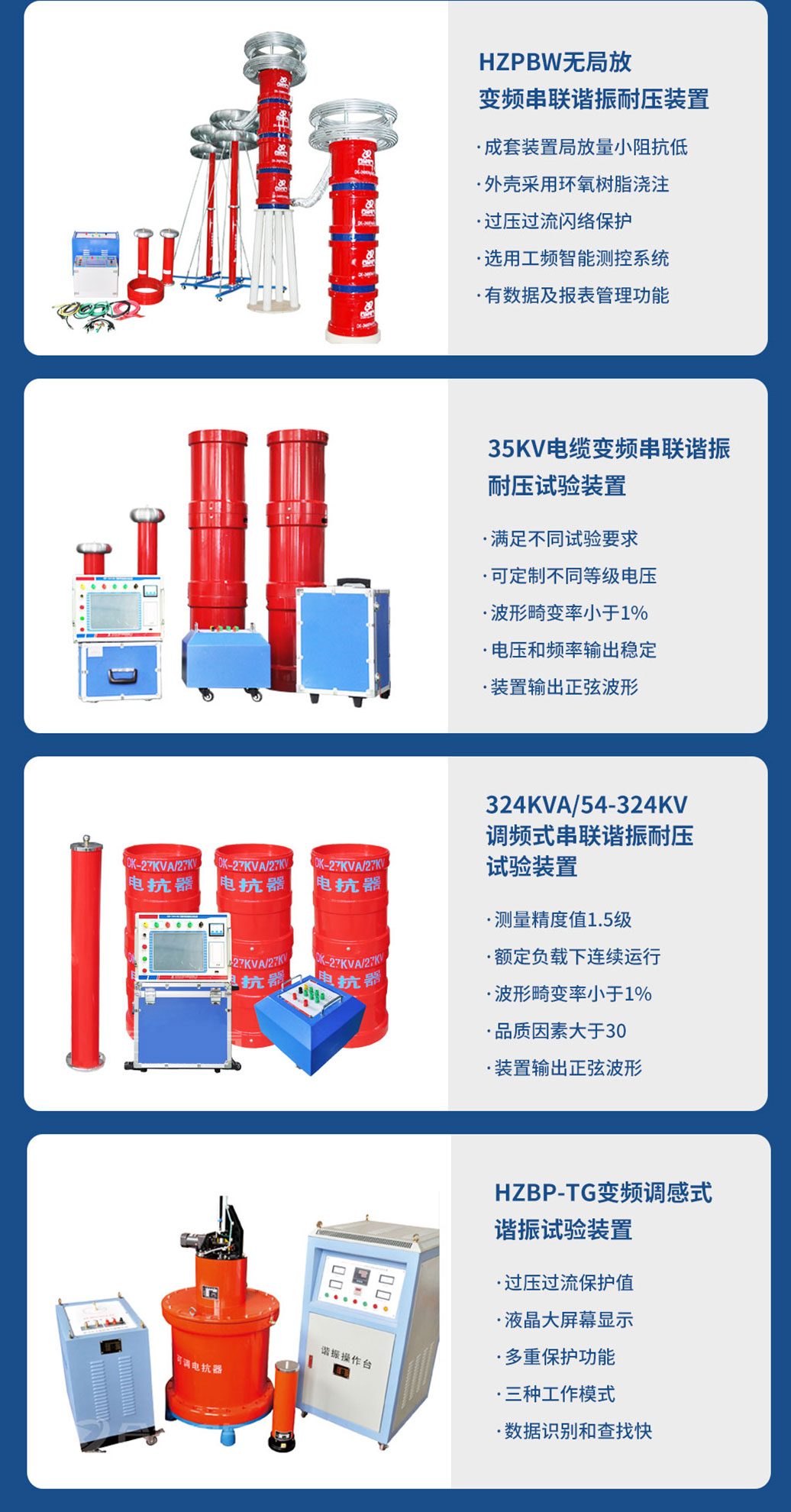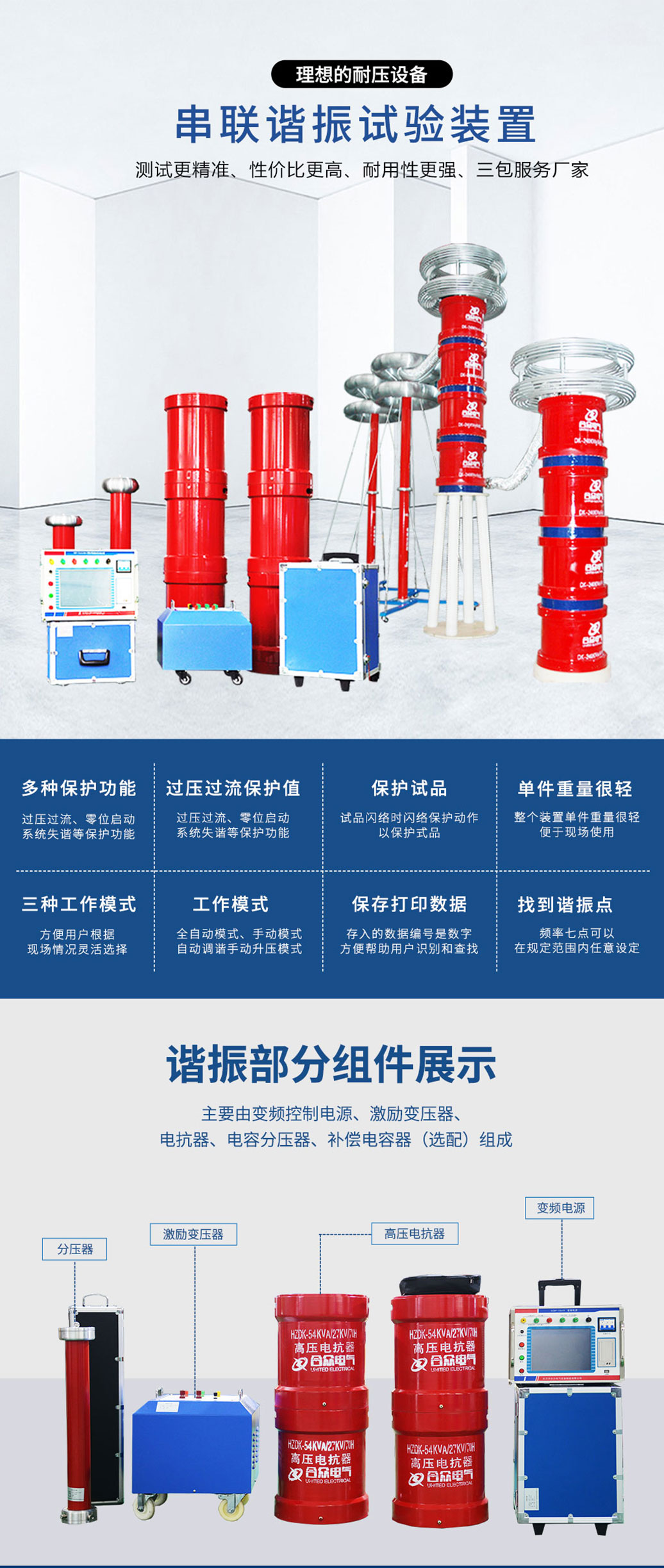 *串聯(lián)諧振試驗裝置主要針對交聯(lián)電纜、水力發(fā)電機、主變、母線、GIS等的交流耐壓試驗,具有較寬的適用范圍,是地、市、縣級高壓試驗部門及電力安裝、修試工程單位理想的耐壓設(shè)備。