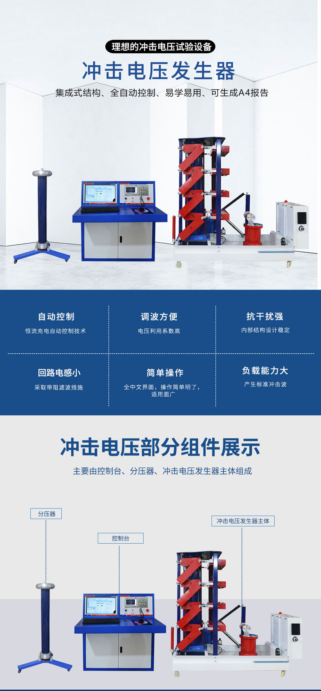 發生器本體、截波、分壓器、四組件控制臺(控制臺分為微機型和普通型)、數字化波形記錄系統等組成。