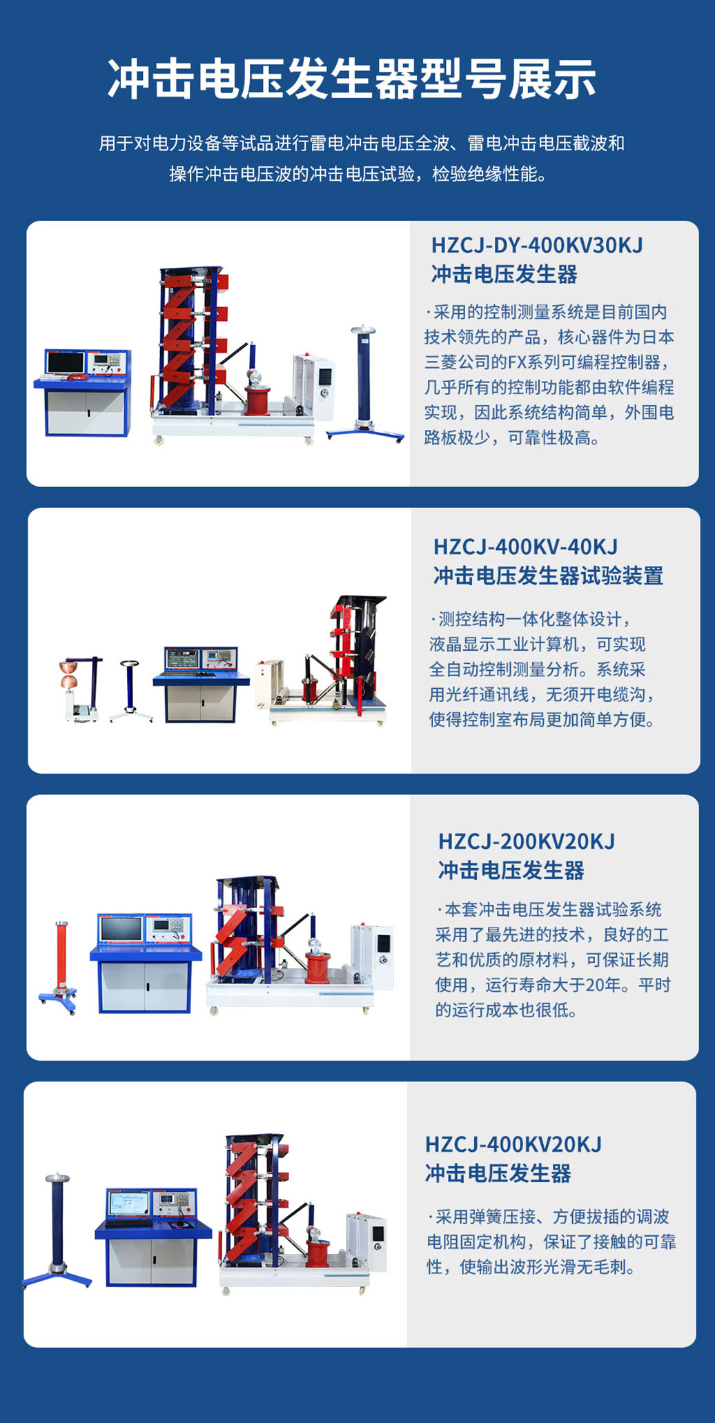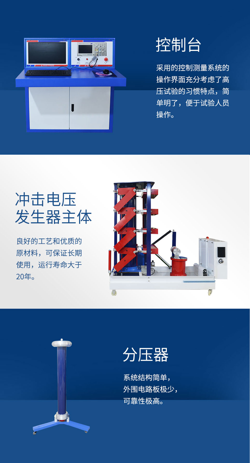 主要用于電力設備等試品進行雷電沖擊電壓全波、雷電沖擊電壓截波和操作沖擊電壓波的沖擊電壓試驗,檢驗絕緣性能。