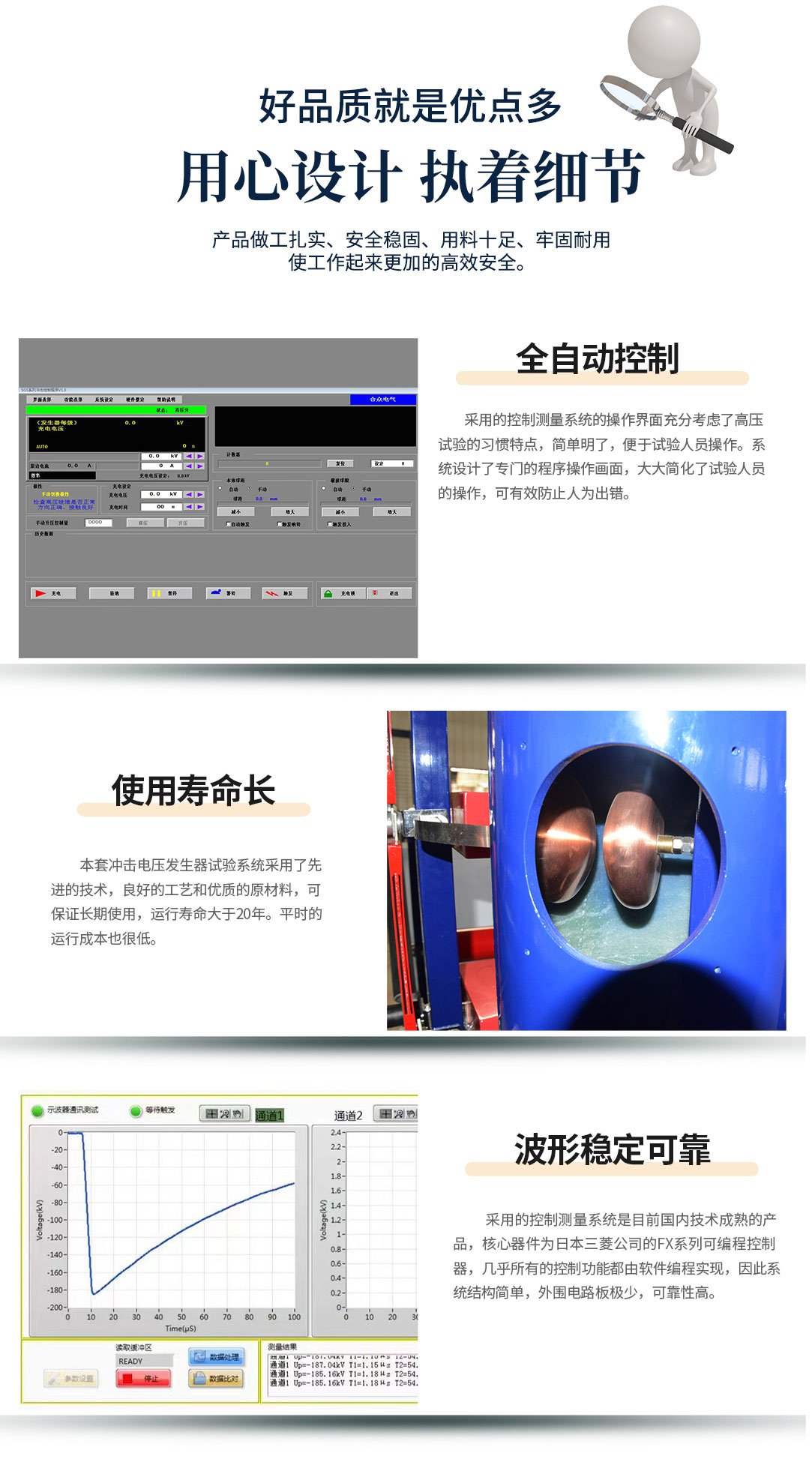 波頭時間:1.2±30%μs,波尾時間:50±20%μs,過沖:小于5%,效率:不低于90%。±1.2/50μs標準雷電沖擊電壓全波,效率大于90%。