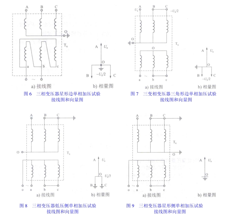 當被試三相變壓器低壓繞組的各端子都能引出時,可以采用圖 8 和圖9的接線。圖 8接線只適用于三鐵芯柱變壓器,這種情況下,高壓側被試相相間和對地電壓達試驗電壓 Us中性點電壓達試驗電壓的 1/3;